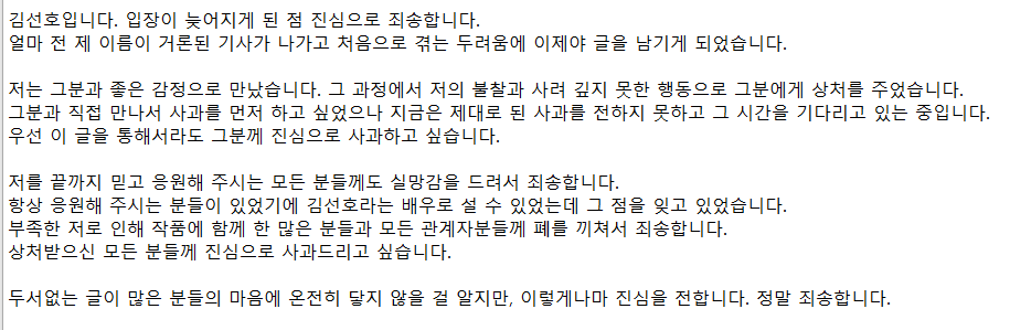 김선호씨가 10월 20일 기준으로 오늘 솔트엔터테인먼트를 통해 모두 인정하고 사과문을 올렸습니다.