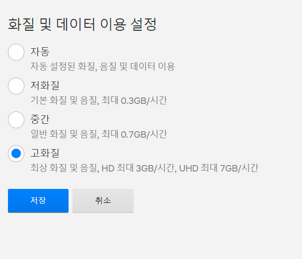 영상의 자체적으로 화질을 변경하는 방법은 없지만 기본설정 자체를 고화질로 바꾸는 방법은 있습니다. 설정을 이렇게 해놨는데도, 요금제가 스탠다드 이상인데도 영상화질이 이상하다면 고객센터에 문의를 하시는 것이 좋습니다.