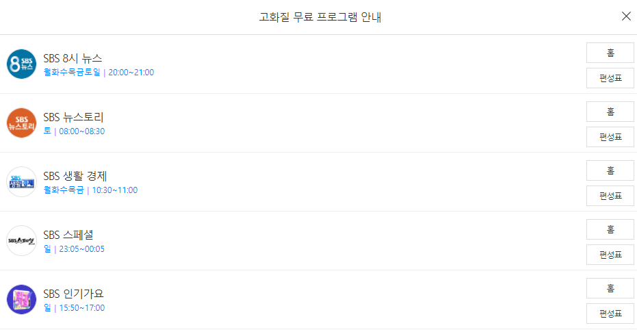 SBS에서는 고화질을 이용하려면 유료를 이용해야하지만 그렇지 않는 무료프로그램들도 운영하고 있습니다. 아래 링크를 타고 사이트를 가시면 원하는 프로그램들은 무료로 시청이 가능합니다. 사진보다 더 많은 프로그램들을 무료로 제공하고있어 관심있는 프로그램들이 있으시다면 원하는 것들을 고화질로 다시보기를 이용해 보시는 것도 좋을 것 같습니다