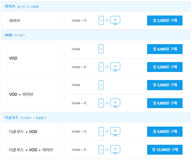 무료로 이용하는 실시간보기는 SBS에서도 일반화질로 제공되고 있습니다. 하지만 결제를 하시면 고화질로도 이용하실 수 있는데요, 가격은 아래의 표와 같습니다. 실시간만 이용을 하신다면 고화질로 볼 수 있는 월결제를 이용할 수 있는데요, 가격은 저렴한 편이긴 합니다. 그런데 특이하게도 선택한 기간동안만 결제를 할 수도 있도록 해놨습니다.