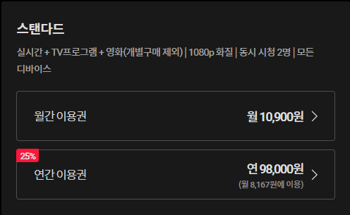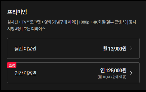 요금제는 총 4가지로 구성되어 있습니다. 넷플릭스와 비슷한 이용권결제 시스템인데요, 다른점이라고 하면 연간이용권 결제가 있어 조금 더 할인된 가격으로 이용할 수 있다는 점이 다릅니다.